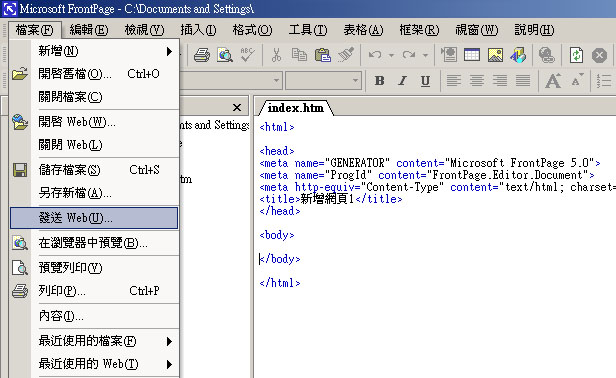 Step 2 - 在 Frontpage的選單中按 <檔案> ,再按<發送