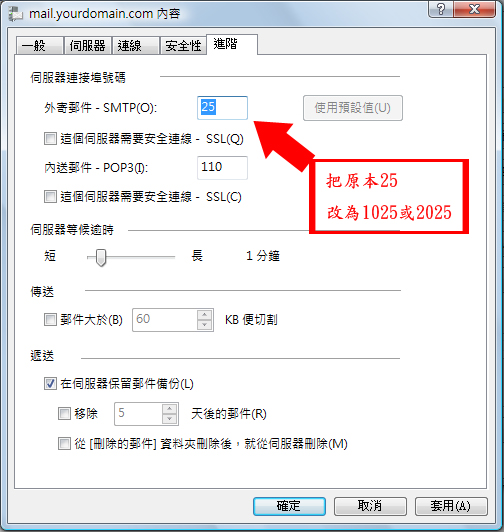 在 "伺服器傳輸埠" 一欄,把原本的 "25" 改為 "1025" 或